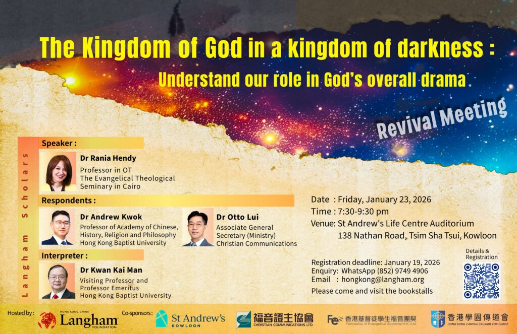Dr Rania Hendy, a native of Egypt who is the first woman to receive a doctorate in Old Testament, and a Langham Scholar, who now serving as Professor of Old Testament at the Evangelical Theological Seminary in Cairo, Egypt, is invited to deliver a revival message, titled: “The Kingdom of God in a Kingdom of Darkness: Understand Our Role in God’s Overall Drama”.